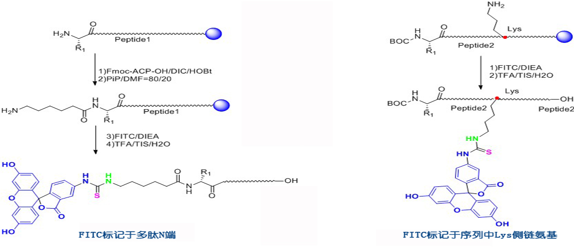 FITC標記 FITC(異硫氰酸熒光素)具有比較高的活性,我們公司可以通過兩種方式將FITC標記于多肽 上:(1) 將FITC標記于賴氨酸(Lys)或被選擇性地脫保護的鳥氨酸(ornithine)側鏈氨基 上;(2) 將FITC標記于多肽N端氨基。